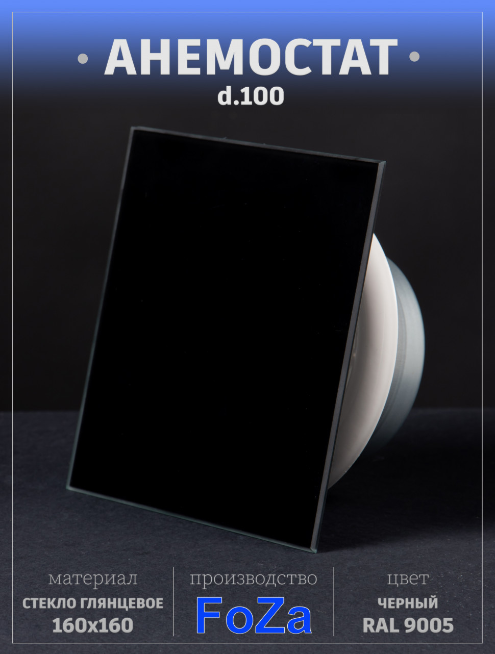 Анемостат со стеклянной внешней частью FOZA D 100 мм. Глянцевое стекло 160х160 мм. Цвет Чёрный. RAL 9005FZ100-bel-gl-kvadrat