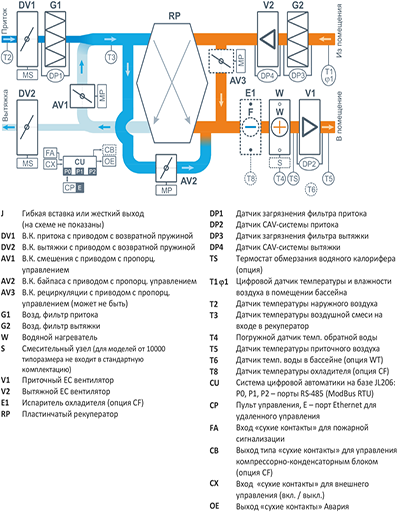 CAV – Постоянный расход воздуха (штатно) DS – Удаленное управление через web-интерфейс WT – Задание температуры воздуха в помещении по температуре воды в бассейне PW – Дополнительный водяной калорифер (преднагреватель – ограничитель) CF – Дополнительный фреоновый охладитель и управление ККБ EH – Электрический калорифер, устанавливаемый вместо водяного калорифера (до 6 кВт) Совместимое оборудование TPD-283U-H – Пульт управления Breezart с цветным сенсорным дисплеем VPD-132N-H – Пульт управления с цветным сенсорным дисплеем, защита IP65 (промышленный дизайн) VPD-173N – Дополнительная панель управления, диагональ 7", защита IP65 (только главный экран)